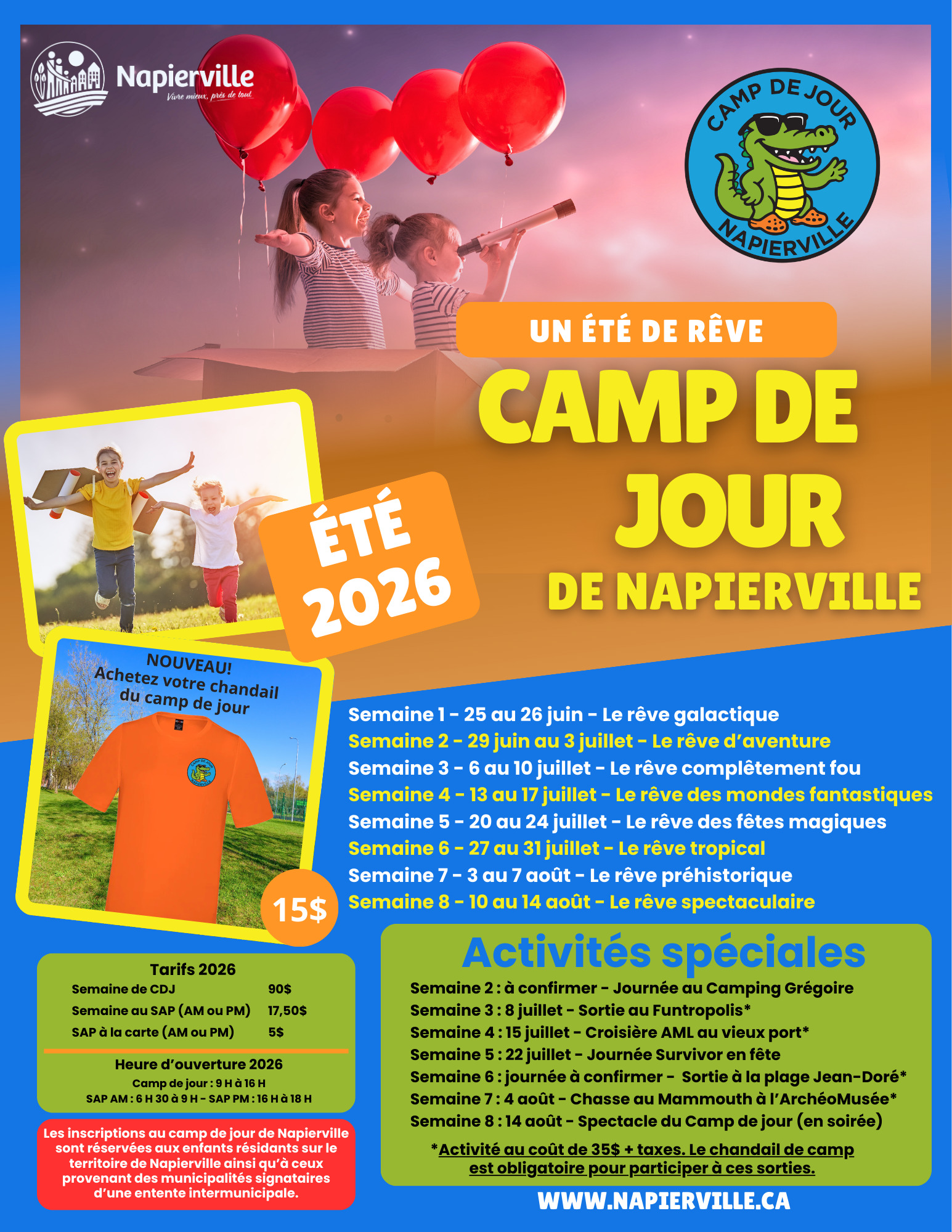 Le camp de jour est réservé uniquement aux résidents de Napierville et aux résidents des municipalités ayant une entente intermunicipale concernant le service de camp de jour avec la Municipalité de Napierville.
