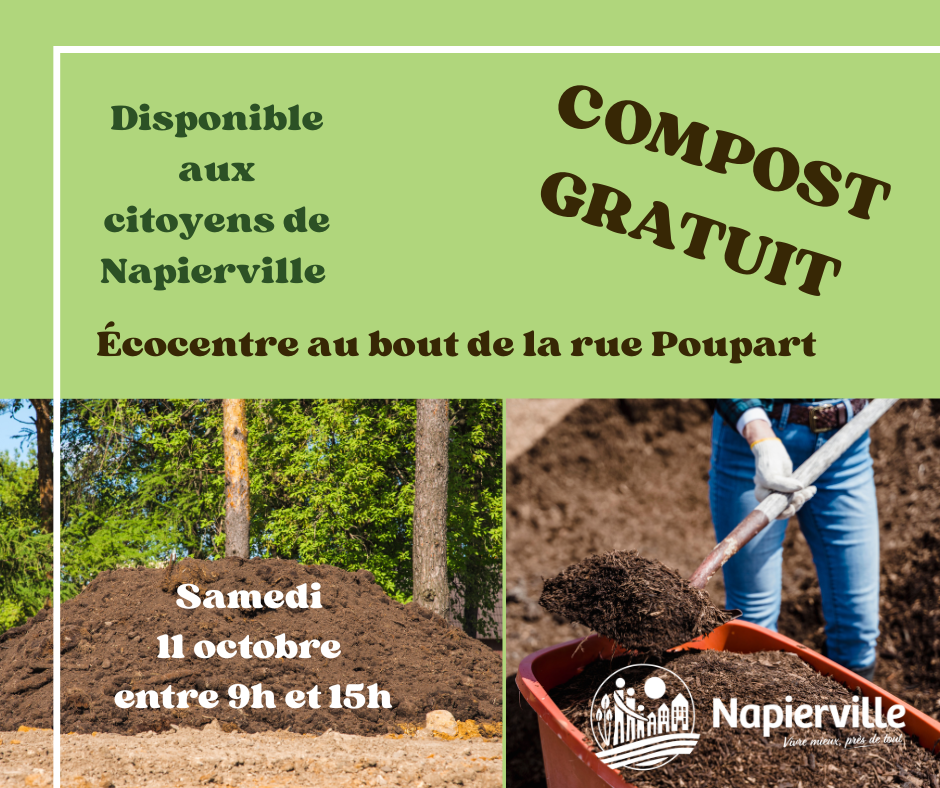 À tous les citoyens de Napierville, avec le beau temps qui se poursuit, certains souhaitent peut-être mettre encore un peu d'effort sur leur terrain. Comme au printemps, une distribution de compost aura lieu ce samedi le 11 octobre entre 9h et 15h à l'écocentre au bout de la rue Poupart.