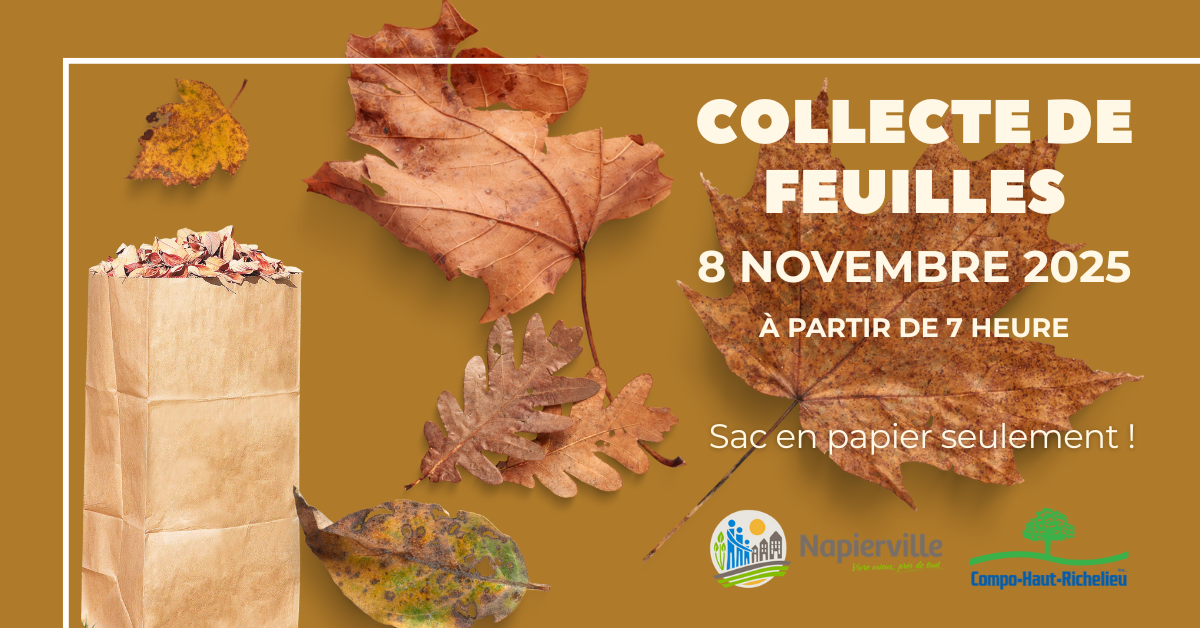 La collecte des feuilles mortes aura lieu le 𝟴 𝗻𝗼𝘃𝗲𝗺𝗯𝗿𝗲 𝟮𝟬𝟮𝟱 𝗮̀ 𝗽𝗮𝗿𝘁𝗶𝗿 𝗱𝗲 𝟳𝗵 𝗮̀ 𝗡𝗮𝗽𝗶𝗲𝗿𝘃𝗶𝗹𝗹𝗲. Cette année seuls les sacs en papier seront acceptés, les sacs de plastique, même compostables, ne seront pas ramassés.